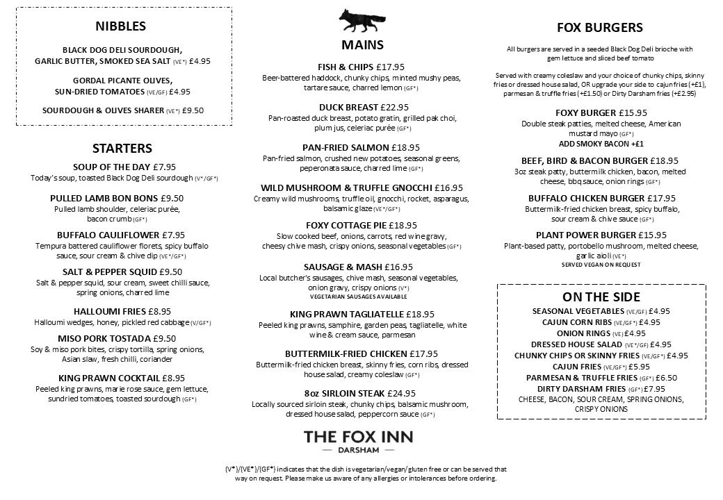 You'll find our current seasonal menu below, as well as our Little Foxes menu. We serve food all day every day from 12pm til 9pm. We are proud to offer a variety of gluten free and vegan dishes to cater for all audiences.